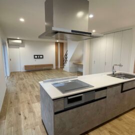 子育て世代の若いご夫婦が、ご両親の住まいの隣りにお家を建てられた。外観・内装ともホワイトとグレーを基調とした色合いを選ばれ、シンプルでやさしい雰囲気に仕上がっている。LDKはリビング階段になっていて、階段下のスペースは、将来お子様がリビング学習も出来るようにカウンターとして計画した。収納スペースも充実していて、シューズクロークにはベビーカーや子供用自転車をしまっておく事も可能。断熱・省エネ性能が高く、太陽光発電も設置したZEH住宅。